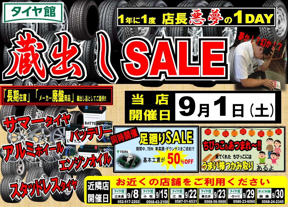 店長悪夢の1DAY 「蔵出しSALE」まであと4日! ポスト 2018年8月28日 愛知県 稲沢市津島市あま市一宮市 岐阜県海津市 その他近隣のお客様、こんにちは。 愛知県稲沢市福島町のタイヤ館 稲沢です。 店長悪夢の1DAY 「蔵出しSALE」まであと4日! 昨年に引き続き、エリア総力をあげてのイベントが 9月1日(土)開催決定しました。 そろそろタイヤ交換だけど 良い物が安くお値打ちに買えたらな~ 今冬はスタッドレス購入予定だけど、お値打ちに買えたらな~ な~んてお客様 チャンスです。 愛知県内 タイヤ館の蔵出し商品を大放出!! ぜひこの機会にご来店ください。 カテゴリ:お知らせ