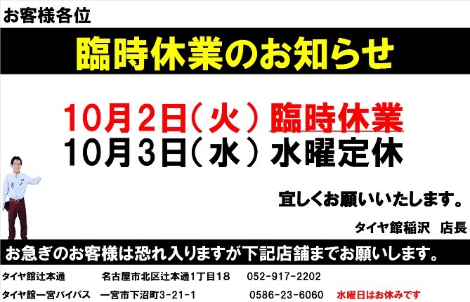 明日 10月2日は臨時休業とさせていただきます。