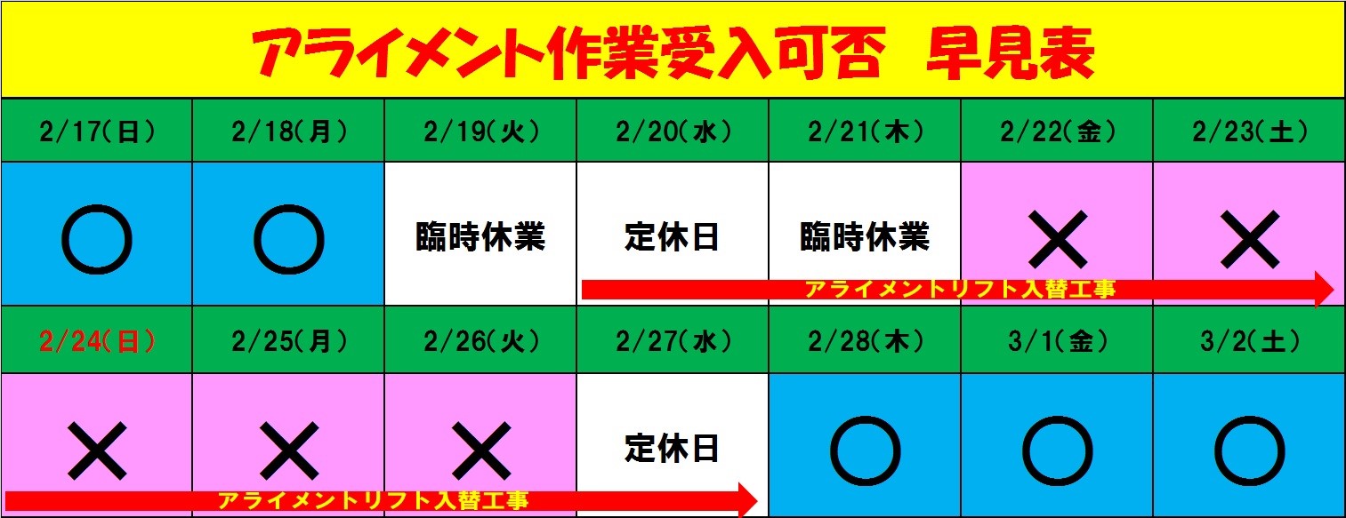 この期間中、アライメント作業の受付を中止させて頂きます。