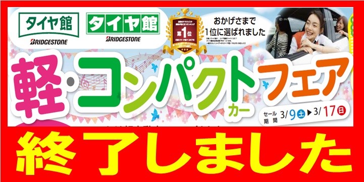 軽・コンパクトカーフェア 終了しました ポスト 2019年3月17日 愛知県 稲沢市津島市あま市一宮市 岐阜県海津市 その他近隣のお客様、こんにちは。 愛知県稲沢市福島町のタイヤ館 稲沢です。 軽・コンパクトフェア 終了しました! がしかし、またまたセールがあります!! 3/24日までは 『春の集中得市』開催しています。 そろそろ天候も暖かくなりタイヤ交換だけど 良い物が安くお値打ちに買えたらな~ な~んてお客様 チャンスです。 ぜひこの機会にご来店ください。 カテゴリ:お知らせ