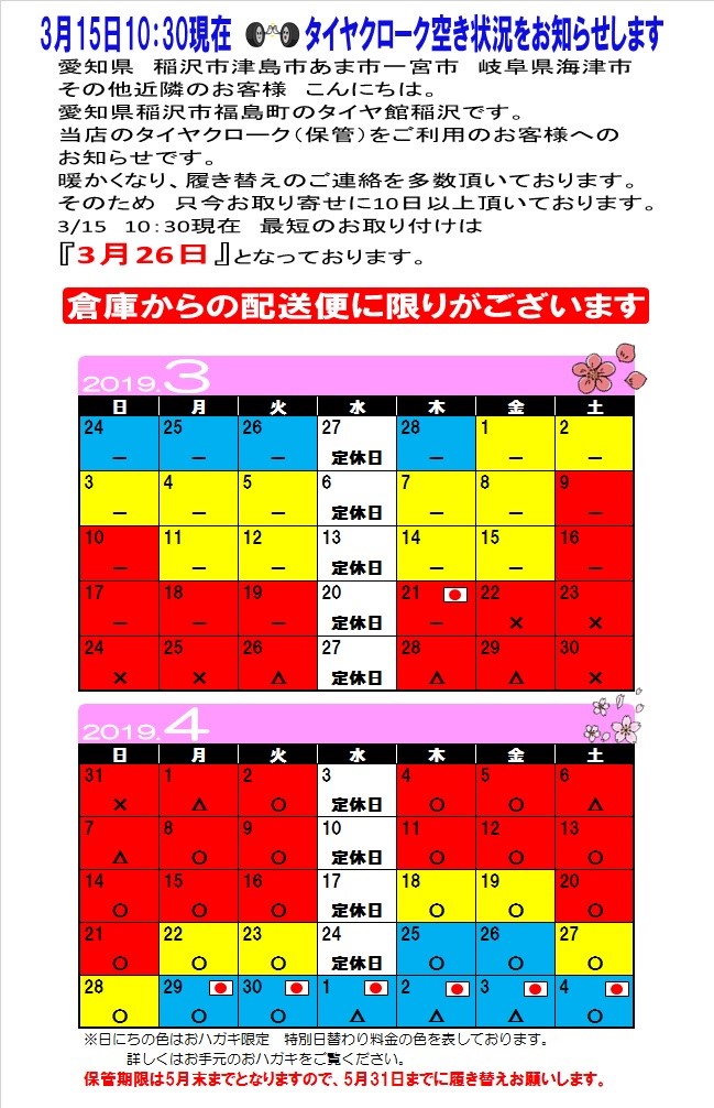 3月15日 10:30現在のタイヤ保管脱着PIT空き状況をお知らせします。