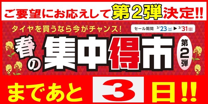 春の集中得市 第2弾開催まであと3日 ポスト 2019年3月20日 愛知県 稲沢市津島市あま市一宮市 岐阜県海津市 その他近隣のお客様、こんにちは。 愛知県稲沢市福島町のタイヤ館 稲沢です。 本日は定休日でお休みさせて頂いております。 現在 集中得市開催中ですが... おかわり決定しました!! 第2弾開催まであと3日!です 3/23.24の二日間はダブル集中得市!! 第1弾 第2弾のダブルでお得です。 そろそろ天候も暖かくなりタイヤ交換だけど 良い物が安くお値打ちに買えたらな~ カテゴリ:お知らせ