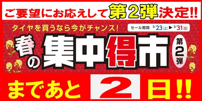 春の集中得市 第2弾開催まであと2日 ポスト 2019年3月21日 愛知県 稲沢市津島市あま市一宮市 岐阜県海津市 その他近隣のお客様、こんにちは。 愛知県稲沢市福島町のタイヤ館 稲沢です。 現在 集中得市開催中ですが... おかわり決定しました!! 第2弾開催まであと2日!です 3/23.24の二日間はダブル集中得市!! 第1弾 第2弾のダブルでお得です。 そろそろ天候も暖かくなりタイヤ交換だけど 良い物が安くお値打ちに買えたらな~ なんてお客様 チャンスですよ~!! ぜひぜひこの機会にタイヤ館をご利用ください。 カテゴリ:お知らせ
