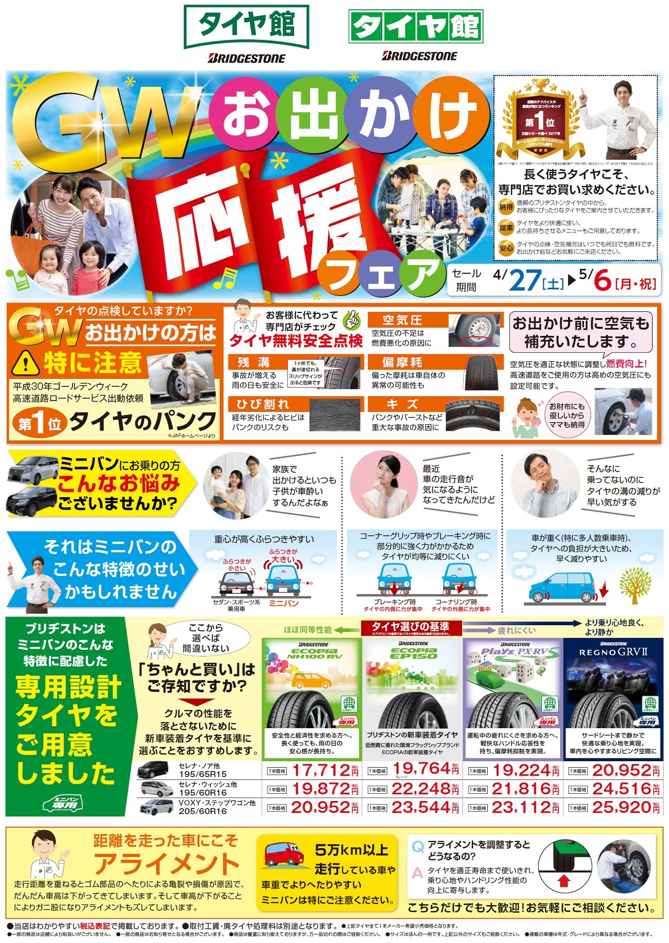明日 チラシが入ります!! ポスト 2019年4月26日 愛知県 稲沢市津島市あま市一宮市 岐阜県海津市 その他近隣のお客様、こんにちは。 愛知県稲沢市福島町のタイヤ館 稲沢です。 GWのお出かけ応援フェア 開催中ですが 明日チラシが入ります!! 明日からゴールデンウィーク♪ 楽しみですね。 でも愛車はメンテナンスされていますか? 良い物が安くお値打ちに買えたらな~ な~んてお客様 チャンスです。 ぜひこの機会にご来店ください。 カテゴリ:お知らせ