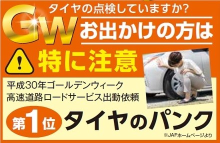 明日からゴールデンウィーク!! 愛車の点検どうですか? ポスト 2019年4月26日 愛知県 稲沢市津島市あま市一宮市 岐阜県海津市 その他近隣のお客様、こんにちは。 愛知県稲沢市福島町のタイヤ館 稲沢です。 明日からゴールデンウィーク!! 楽しみですね~。でも愛車のメンテナンスは大丈夫ですか?? オイルは?バッテリーは??? タイヤの空気圧は??? タイヤ館では、無料で安全点検を実施中! 自分ではわからないって方 どうぞお気軽にご来店ください。 カテゴリ:お知らせ