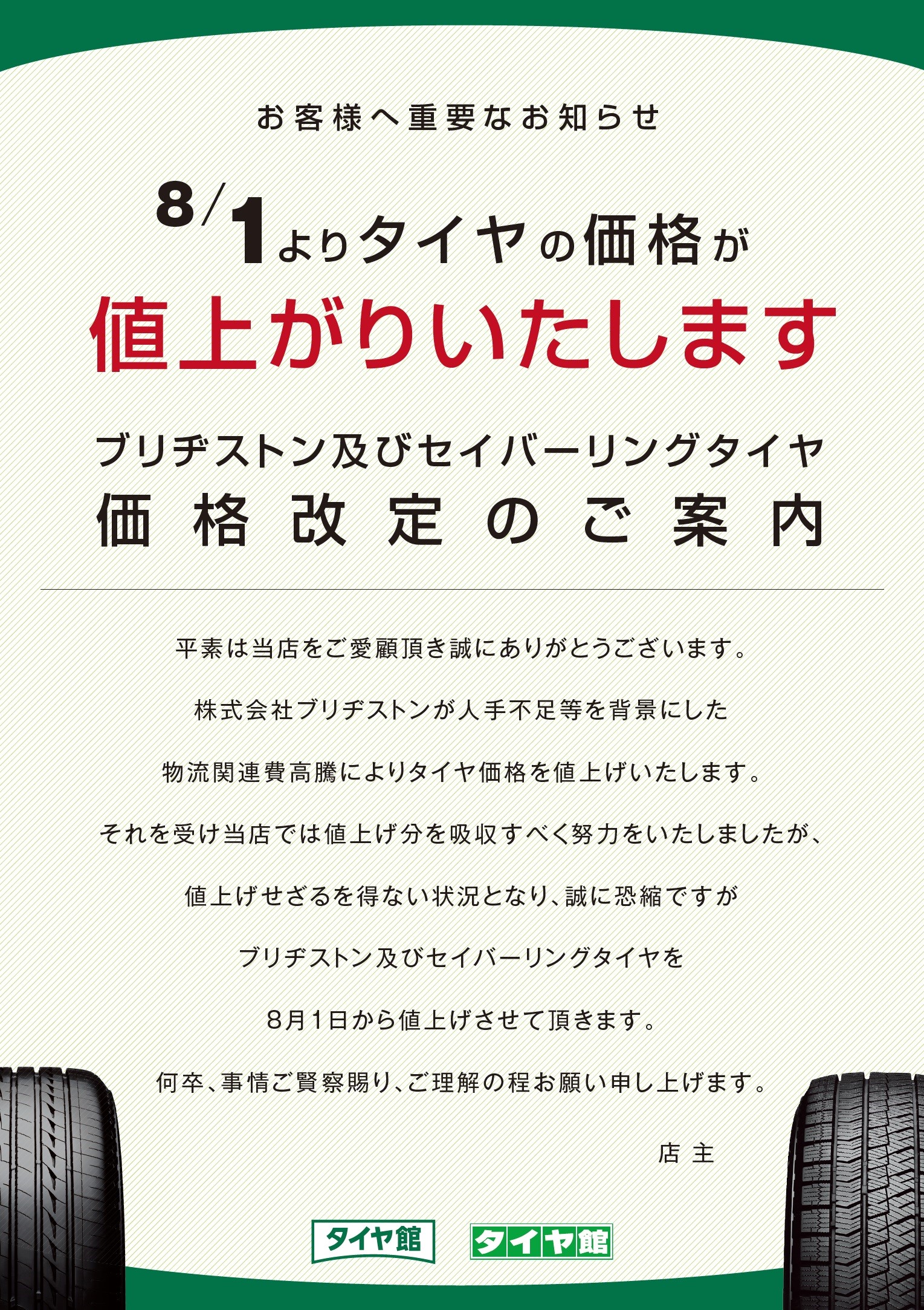 8/1より ブリヂストンタイヤが値上がりいたします。