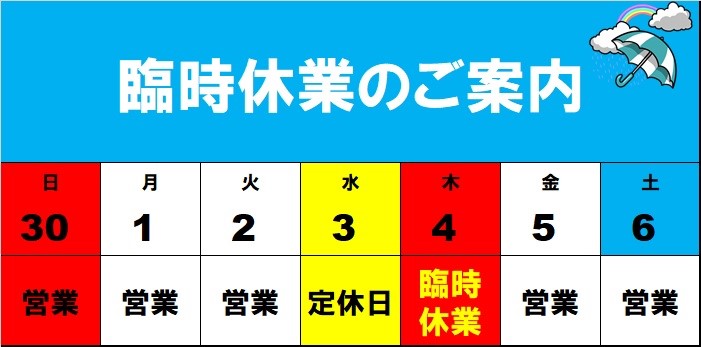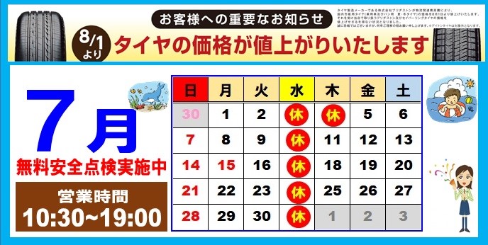 臨時休業のお知らせ ポスト 2019年6月29日 6/3(水)定休日 6/4 臨時休業 とさせて頂きます。 緊急でご用事の場合、 下記店舗は営業しております。 ・名古屋市北区のタイヤ館 辻本通店(月曜定休) ・名古屋市名東区のタイヤ館焼山店(月曜定休) ・名古屋市緑区のタイヤ館鳴海店(月曜定休) ・岐阜市西島町のタイヤ館岐阜北店(月曜定休) ご利用くださいませ。 6/5(金)は通常営業(朝10:30~19:00)となりますので、どうぞよろしくお願い致します。 カテゴリ:お知らせ