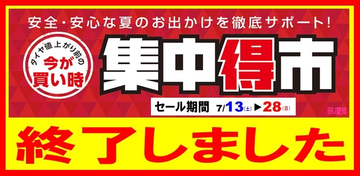 集中得市 終了しました。 ポスト 2019年7月28日 愛知県 稲沢市津島市あま市一宮市 岐阜県海津市 その他近隣のお客様 こんにちは。 愛知県稲沢市福島町のタイヤ館稲沢です。 大好評いただきました、集中得市終了しました。 数多くのお客様に来店いただき誠にありがとうございました。 次回セールは8/3~『帰省&行楽応援フェア』を予定しております。 夏休みの行楽前に! 夏のゲリラ豪雨対策に! ぜひぜひタイヤ館稲沢をご利用ください。 カテゴリ:お知らせ
