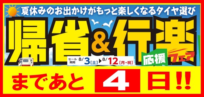 夏休みのお出かけがもっと楽しくなるタイヤ選び『帰省&行楽応援フェア』開催まであと4日! ポスト 2019年7月30日 愛知県 稲沢市津島市あま市一宮市 岐阜県海津市 その他近隣のお客様、こんにちは。 愛知県稲沢市福島町のタイヤ館 稲沢です。 夏休みのお出かけがもっと楽しくなるタイヤ選び『帰省&行楽応援フェア』開催まであと4日! 昨日梅雨あけました。夏です。 夏のゲリラ豪雨・台風と雨が多くなるこれからの季節 でも愛車はメンテナンスされていますか? 良い物が安くお値打ちに買えたらな~な~んてお客様 チャンスです。 ぜひこの機会にご来店ください。 カテゴリ:お知らせ