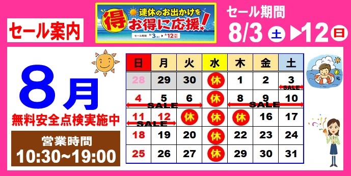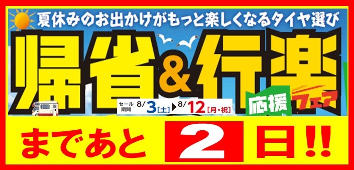 夏休みのお出かけがもっと楽しくなるタイヤ選び『帰省&行楽応援フェア』開催まであと2日! ポスト 2019年8月1日 愛知県 稲沢市津島市あま市一宮市 岐阜県海津市 その他近隣のお客様、こんにちは。 愛知県稲沢市福島町のタイヤ館 稲沢です。 夏休みのお出かけがもっと楽しくなるタイヤ選び『帰省&行楽応援フェア』開催まであと2日! 昨日梅雨あけました。夏です。 夏のゲリラ豪雨・台風と雨が多くなるこれからの季節 でも愛車はメンテナンスされていますか? 良い物が安くお値打ちに買えたらな~な~んてお客様 チャンスです。 ぜひこの機会にご来店ください。 カテゴリ:お知らせ