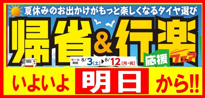 いよいよ明日から 夏休みのお出かけがもっと楽しくなるタイヤ選び『帰省&行楽応援フェア』開催 ポスト 2019年8月2日 愛知県 稲沢市津島市あま市一宮市 岐阜県海津市 その他近隣のお客様、こんにちは。 愛知県稲沢市福島町のタイヤ館 稲沢です。 いよいよ明日から 夏休みのお出かけがもっと楽しくなるタイヤ選び『帰省&行楽応援フェア』開催 昨日梅雨あけました。夏です。 夏のゲリラ豪雨・台風と雨が多くなるこれからの季節 でも愛車はメンテナンスされていますか? 良い物が安くお値打ちに買えたらな~な~んてお客様 チャンスです。 ぜひこの機会にご来店ください。 カテゴリ:お知らせ