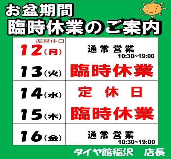本日より 3日間 臨時休業とさせて頂いております。 ポスト 2019年8月13日 愛知県 稲沢市津島市あま市一宮市 岐阜県海津市 その他近隣のお客様、こんにちは。 愛知県稲沢市福島町のタイヤ館 稲沢です。こんばんは。 本日より 3日間は臨時休業+定休日によりお休みさせて頂きます。 8/16(金)より通常営業とさせて頂きますので よろしくお願いします。 カテゴリ:お知らせ