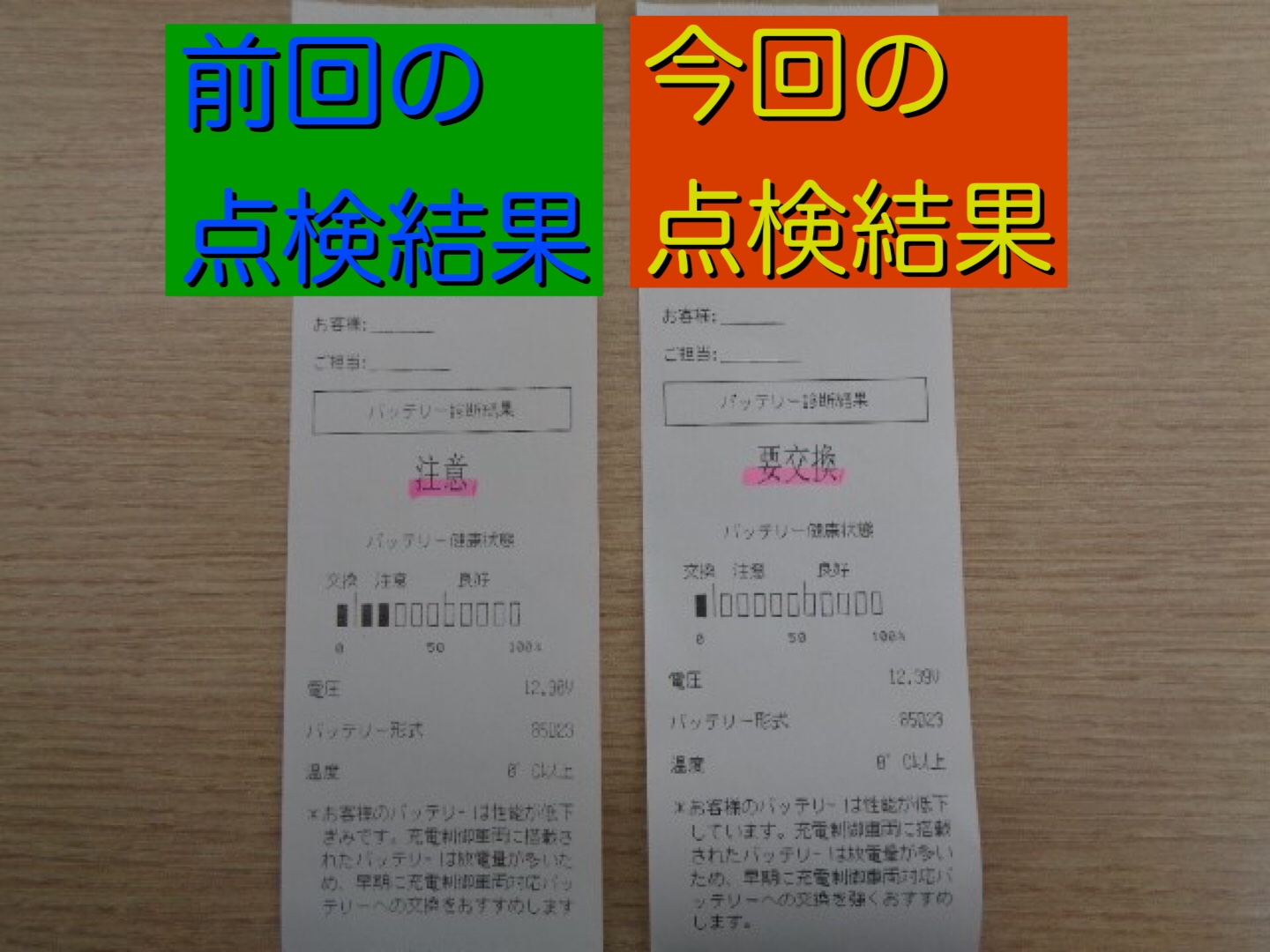 前回注意から2メモリ、電圧12.90Vあったのが、今回は要交換、電圧12.39Vになっていました。