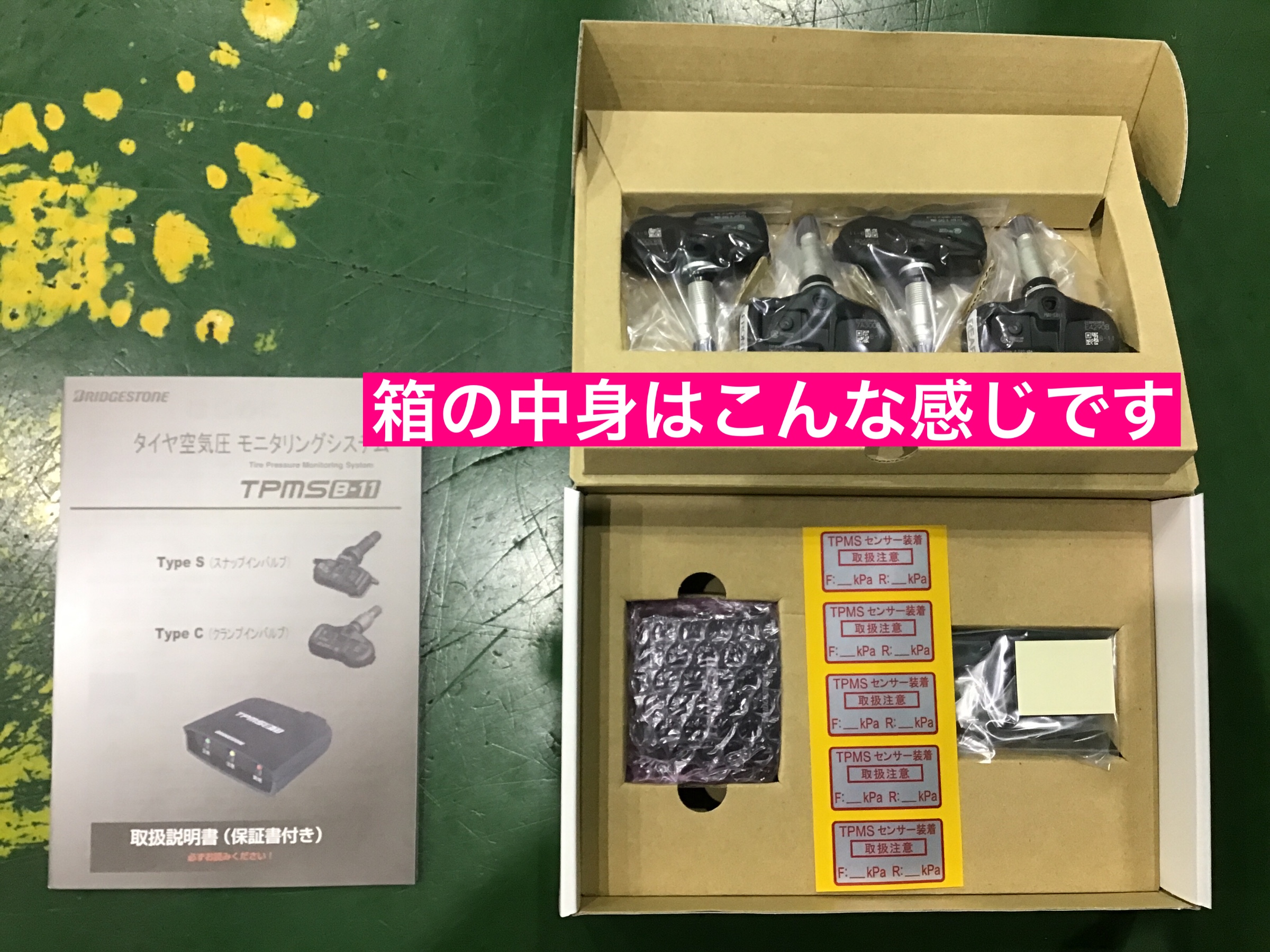 箱の中身はタイヤの空気を測定してくれる、センサーと、本体モニター、電源線と説明書です!