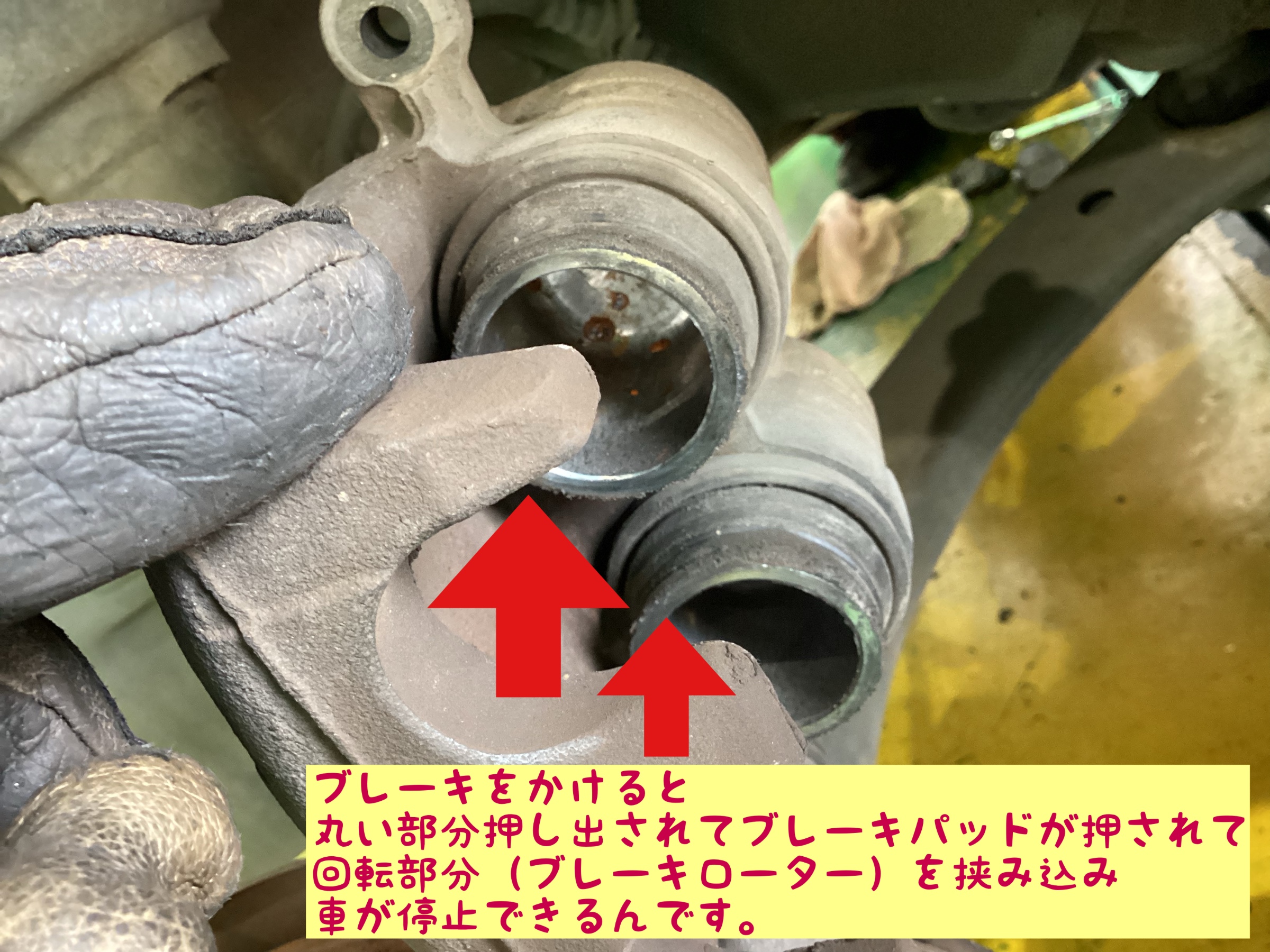 ブレーキパッドは、タイヤと一緒に回転しているブレーキローターという部品を挟み込み