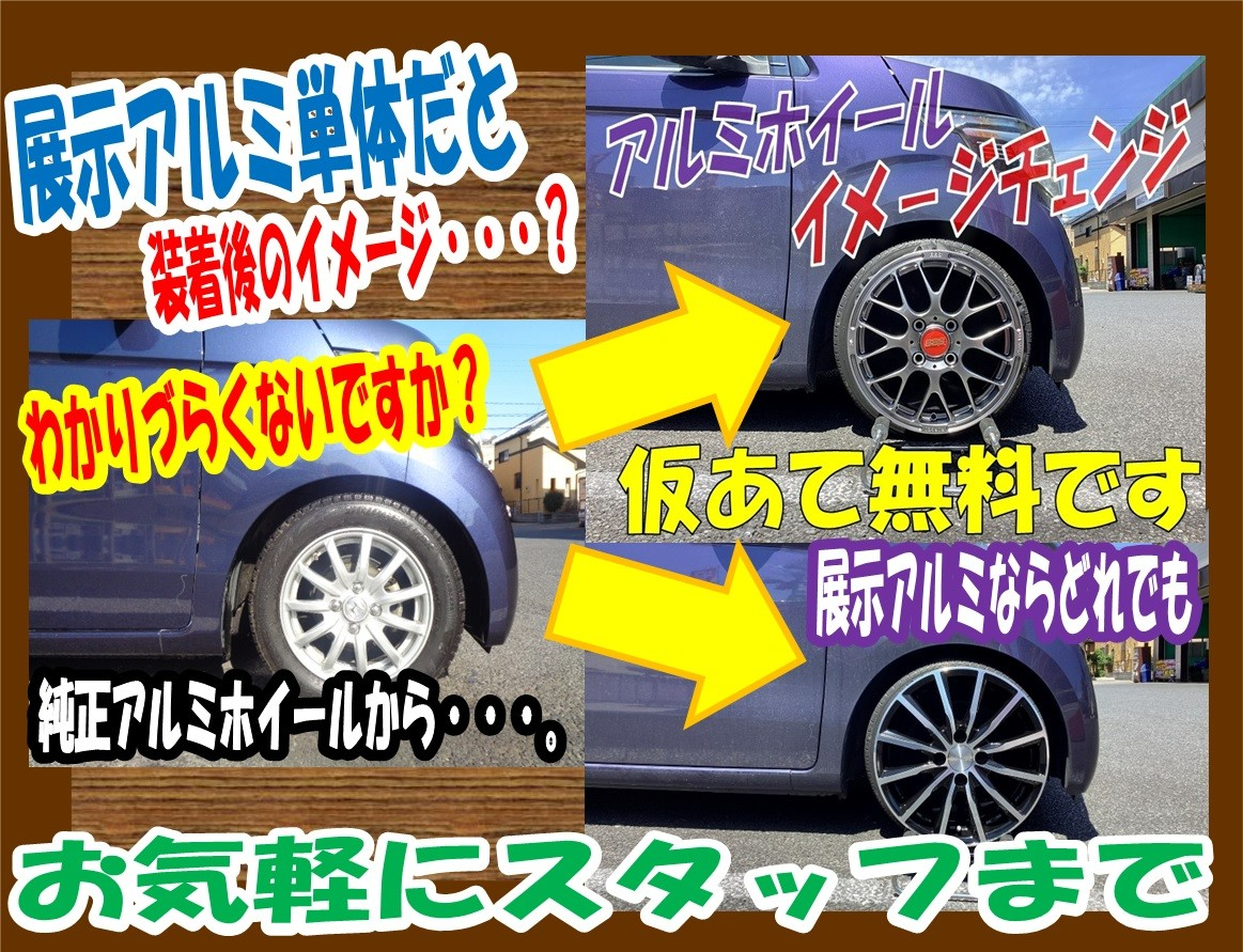 タイヤ館入間では、店頭に並んでいるアルミホイールの無料仮あてを行っています。