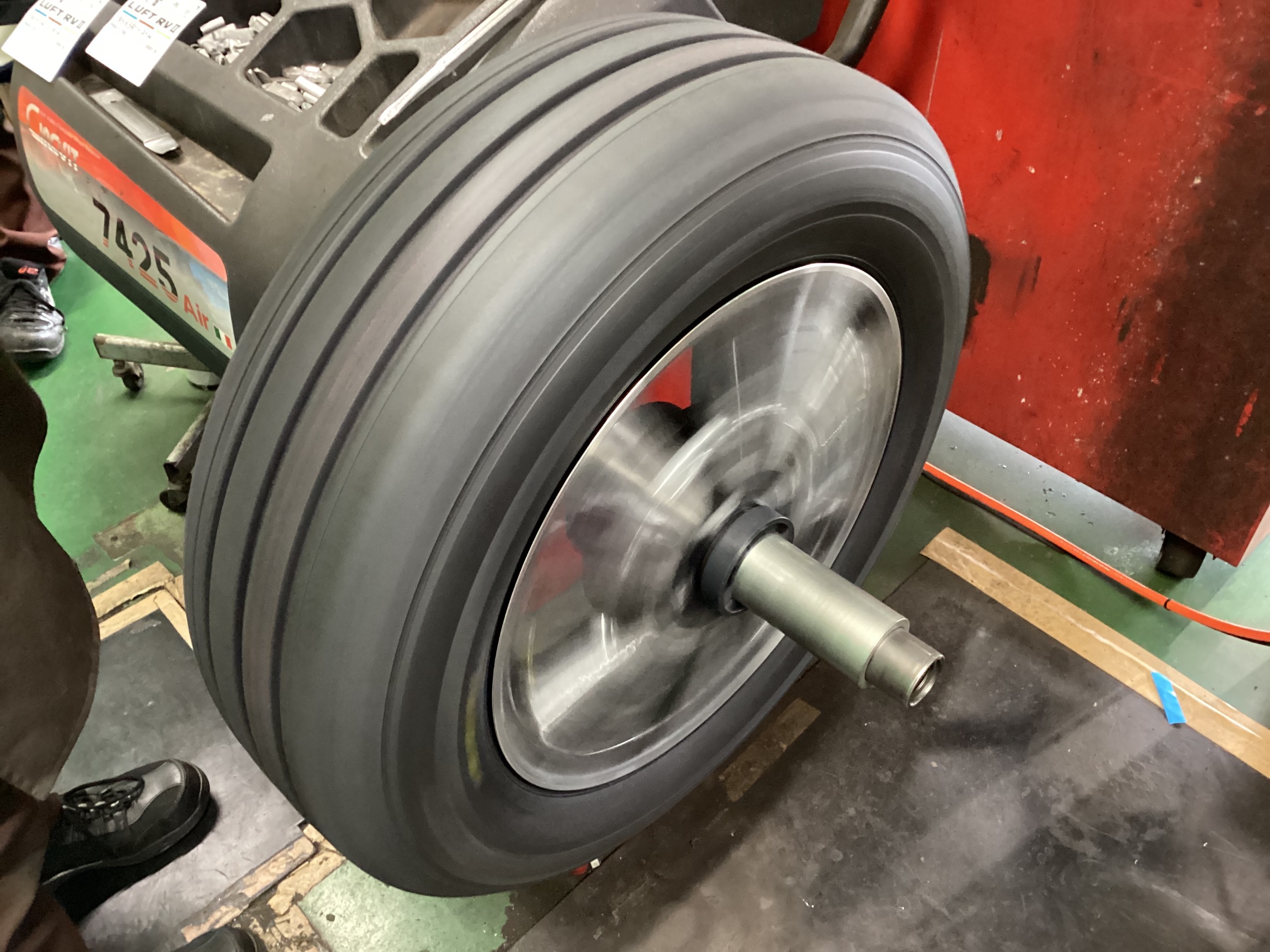 タイヤホイールのバランスの調整をして車両に取付けできるようにしていきます。