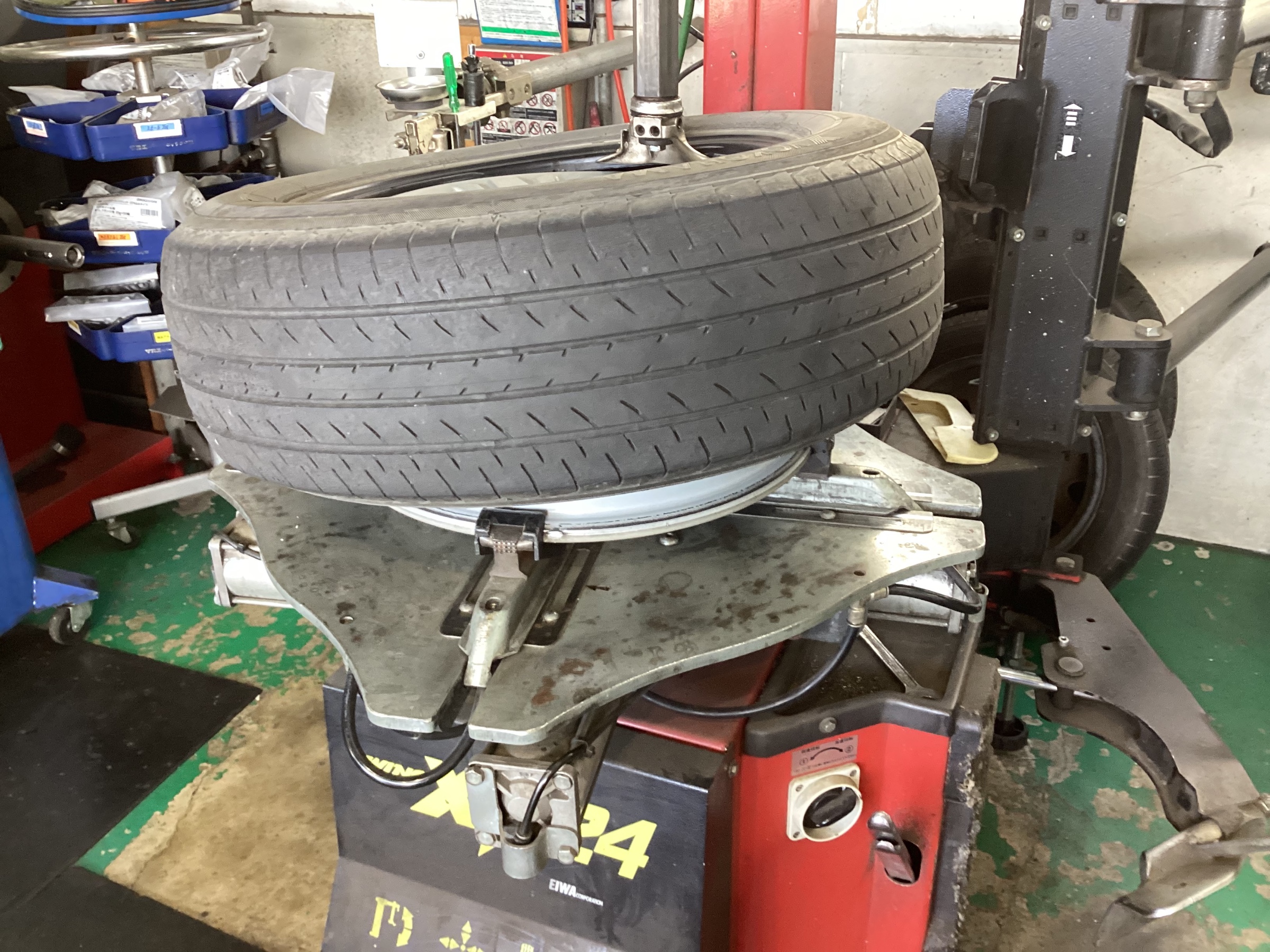 このように機械を使い、前に使用していたタイヤを取り外し、新しいタイヤを組み込みます!