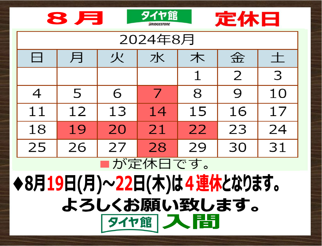 ★8月定休日のお知らせ★ ポスト 2024年7月30日 8月の定休日のご案内です♪ タイヤ館入間のホームページをご覧の皆様 こんにちは・こんばんは! いつもご覧いただきありがとうございます! 【タイヤ館入間 2024年8月定休日のご案内】です。 7日(水)・14日(水)・19日(月)・20日(火)・21日(水)・22日(木) ・28日(水) となります。 勝手ながら、19日~22日は4日間お休みとなりますので何卒ご理解ご協力のほど 宜しくお願い致します。 カテゴリ:お知らせ