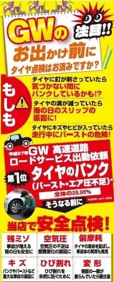 ついに始まりましたGW ポスト 2016年4月29日 ついに始まりましたね、GW!!もうお出掛け先はお決まりですか?(^.^)高速通勤のわたくしはビビッてちょっと早めに家を出てしまいました(笑)さて、GWと言えば高速渋滞…朝から渋滞予測など各メディアで報じられたいましたがみなさん車のメンテナンスはお済ですか?お出掛け前に、点検だけでもお気軽にお寄り下さい♪