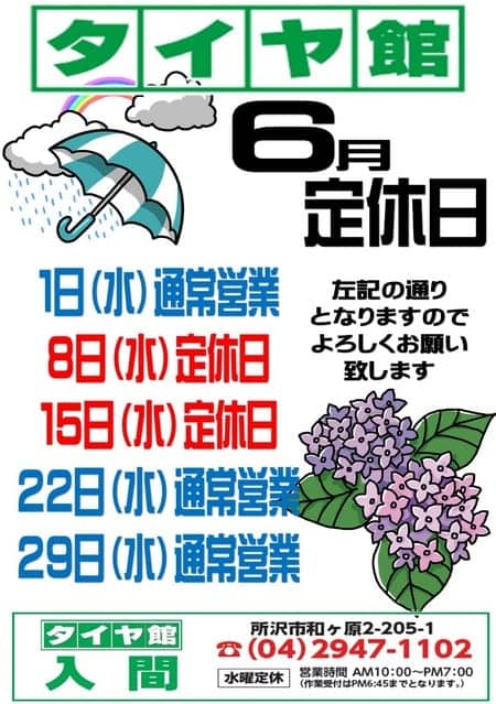 6月定休日 ポスト 2016年5月31日 5月も最終日!!夏タイヤへの履き替え、梅雨に向けてのおクルマの準備はお済みですか?タイヤもメンテナンスもタイヤ館におまかせください0^∂^)=○☆.:*゜..:。:.::.*6月の定休日のおしらせです8日、15日水曜日は定休日となります1日、22日、29日水曜日は10時より通常営業となります6月もタイヤ館入間店元気に頑張りますッご来店お待ちしております