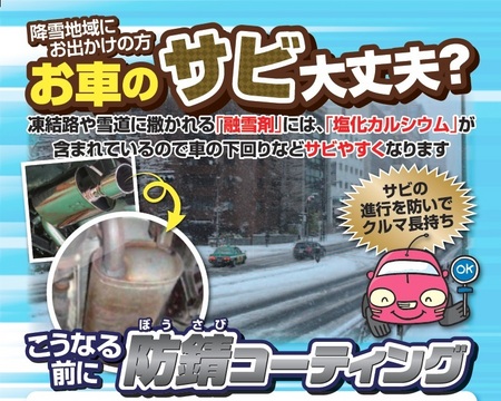防サビ施工 ポスト 2016年11月14日 スタッドレスタイヤ、アルミホイールセットのお取り付け作業とご一緒に下回りの防サビコートをさせていただきました!海の潮風にも注意!ですが冬の凍結路や雪道に撒かれる「融雪剤」に含まれる塩化カルシウムによっておクルマの下回りはサビやすくなってしまいますサビの進行を防いでクルマ長持ち【防錆コート施工】ご一緒にいかがですか?