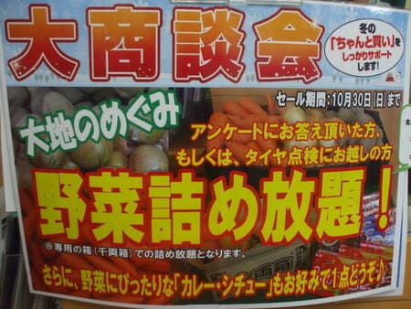 検索タグ:所沢市 入間市 狭山市 飯能市 タイヤ 夏 冬 スタッドレス 野菜 アンケート オイル交換 エアチェック イベント 10月22日 新聞 折り込み 広告