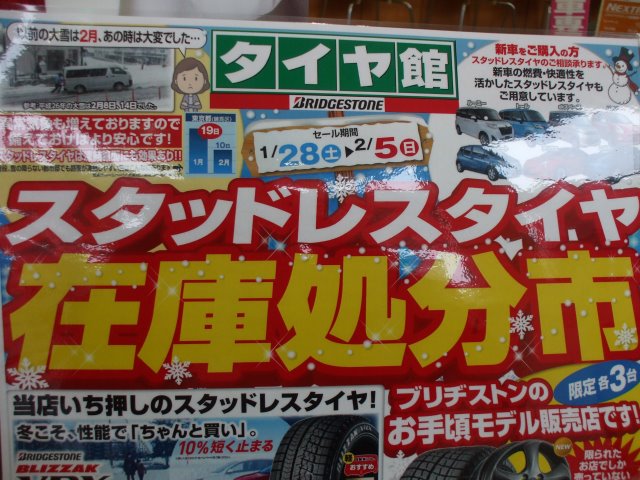セール最終日 ポスト 2017年2月5日 こんにちは!タイヤ館入間です! さて、昨日までの天気とは異なり今にも雨が降りそうな今日この頃となりましたが、 「本日セール最終日」です♪ 夏タイヤも商品入れ替えの為、在庫処分セール同時開催しております♪ スタットレスタイヤ在庫処分! そろそろタイヤ交換・・・とお考えの方! 是非、このセールで得しちゃいましょう♪ 担当:荻野
