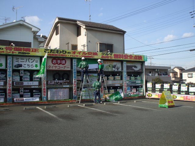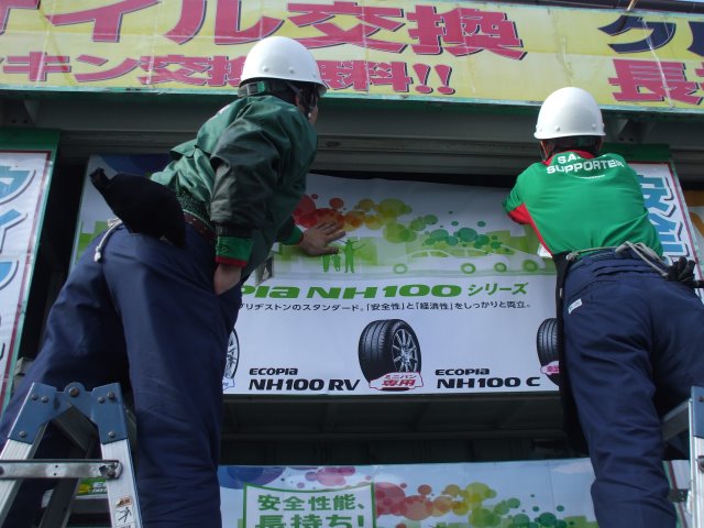 ガレージ展示 ポスト 2017年2月20日 今月発売された新商品NH100シリーズのガレージ展示、お手頃タイヤコーナーを新設中! 高所作業にはヘルメットを装着!!し、スタッフが店外の展示作りを進めています。 店内外、お客様に分かりやすい展示・表示を心がけ、日々スタッフみんなでお店作りをしています! 気になることはなんでもお尋ねくださいねッ
