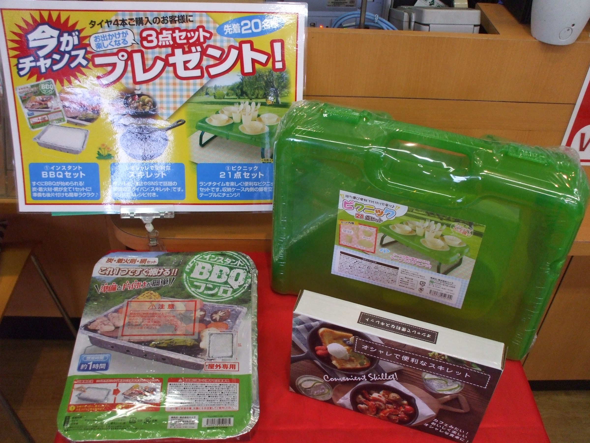 明日から始まる集中得市では、タイヤ4本ご購入のお客様にお出かけが楽しくなる3点セットをプレゼントしちゃいます♪