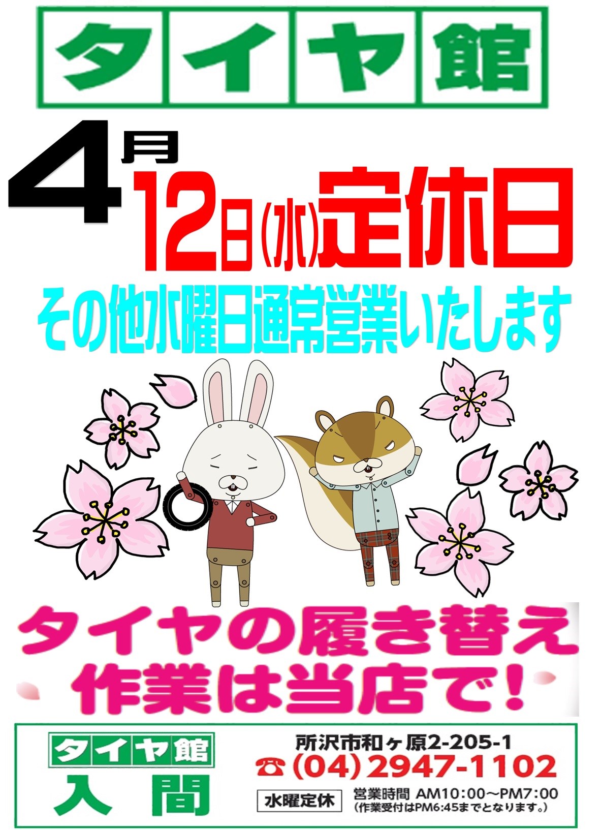 4月定休日のおしらせ ポスト 2017年3月30日 タイヤ館入間店4月の定休日は12日(水)のみとなります。 その他水曜日通常営業いたします。 夏タイヤへの履き替え作業は当店で! HPピット混雑状況随時更新中。ご予約お待ちしております。
