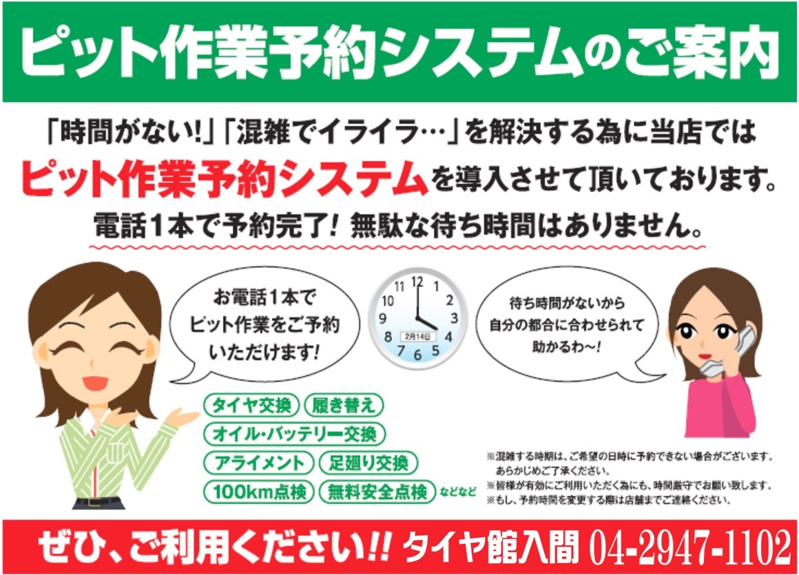 更新しました ポスト 2017年4月17日 タイヤ館入間店ピットの混雑状況カレンダーを更新しました! 「緑」は空きがあります 「黄」はやや混雑 「赤」予約作業は埋まり、混雑状態 随時更新中!HP、お電話でお気軽にお問合せください。 ピット作業はご予約をいただきますとスムーズにご案内できますのでぜひご利用ください!