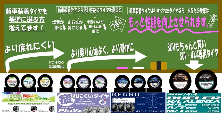 今が買い時! ポスト 2017年5月11日 昨日の定休日ありがとうございました。 夏タイヤの履き替えはお済みですか?本日も元気に営業中ですよ~~~ タイヤ交換をお考えのお客様、タイヤを買うなら今が買い時ですよ! 6/1よりブリヂストン夏タイヤの価格が上がります。 タイヤは新車装着タイヤを基準に「ちゃんと買い」。 タイヤのプロがお客様のニーズに合わせたタイヤ選びをお手伝いさせていただきます。 是非ご相談ください!
