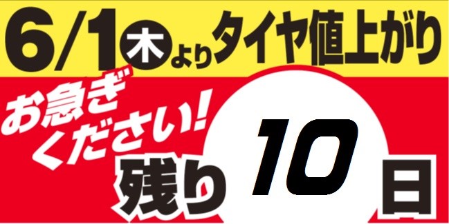 カウントダウン! ポスト 2017年5月22日 ブリヂストン夏タイヤ、ファイアストンタイヤの価格改定まで残り10日! タイヤ交換をお考えの方は値上がり前の今が買い時! 集中得市開催中の当店で「ちゃんと買い」。 是非ご相談ください!