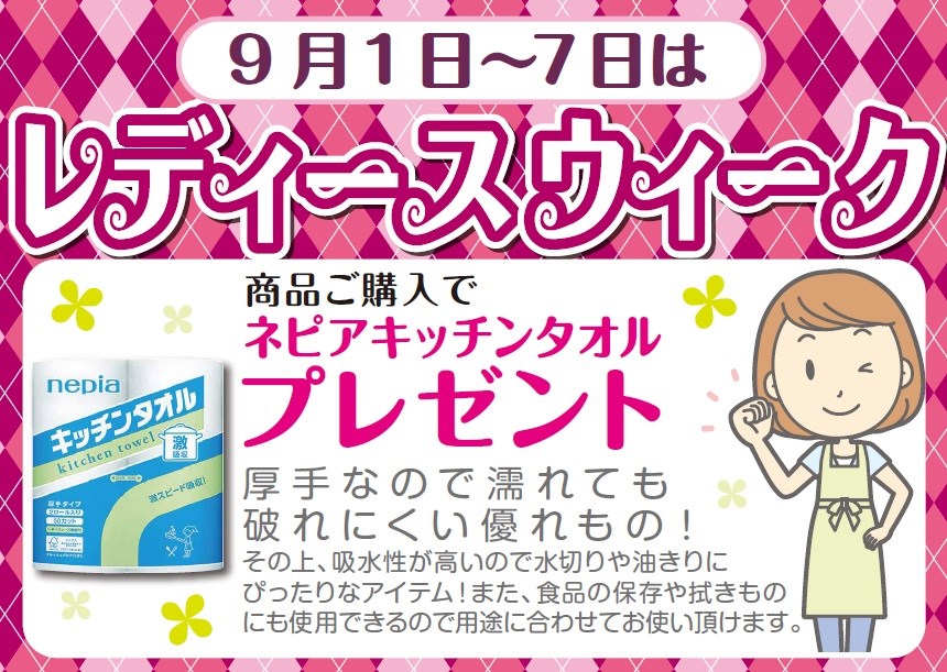 9月も1日から ポスト 2017年8月25日 ☆★☆★☆★女性のお客様にお得な7日間!☆★☆★☆★ 毎月1日から7日は「レディースウィーク」 9月も1日(金)よりスタートです! レディースウィーク期間中商品ご購入の女性のお客様に、9月は「ネピアキッチンタオル」をプレゼント! 1日からのお得な7日間是非当店をご利用ください。 もちろん!おクルマの無料安全点検だけでも大歓迎♪ ご来店お待ちしております。