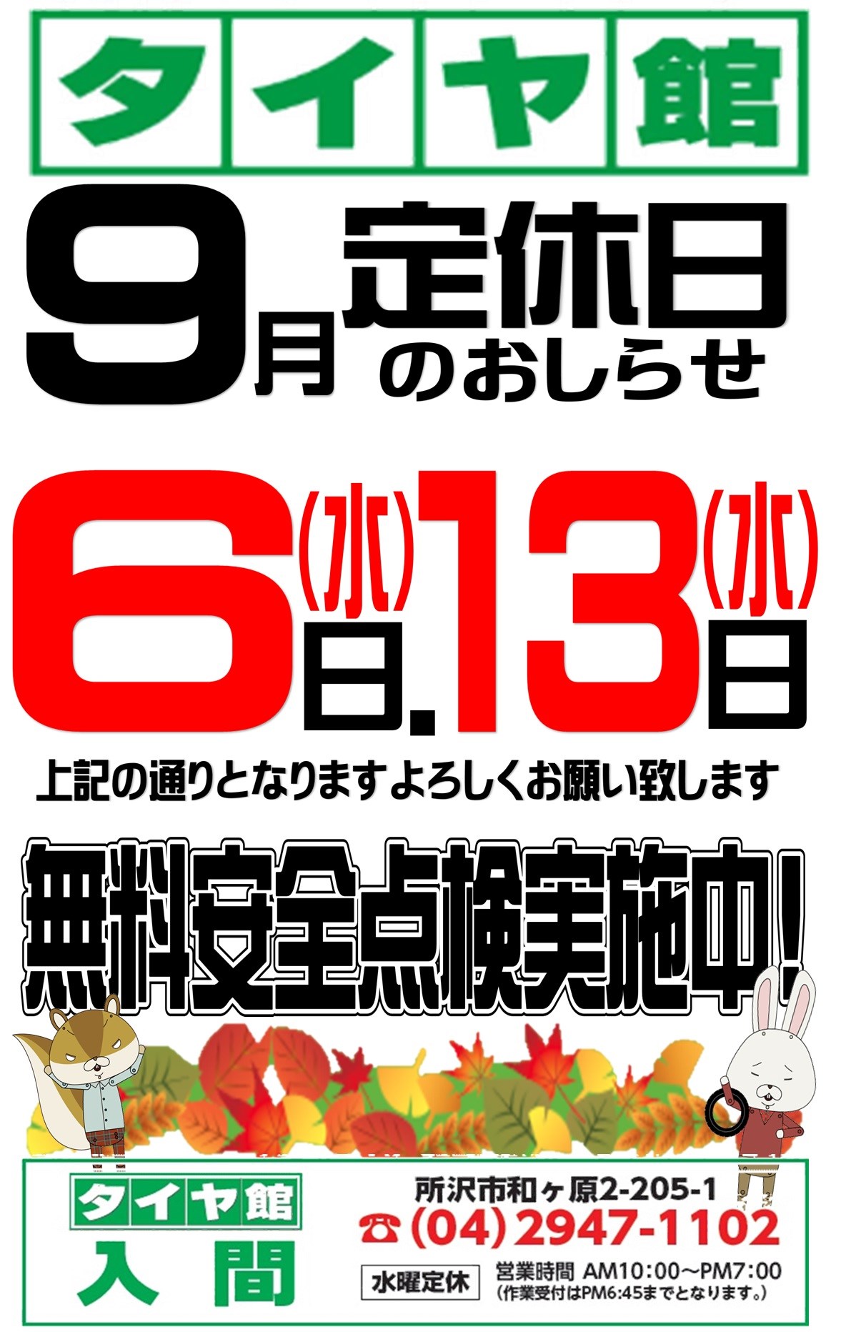 9/6(水)は定休日となります。よろしくお願いいたします。