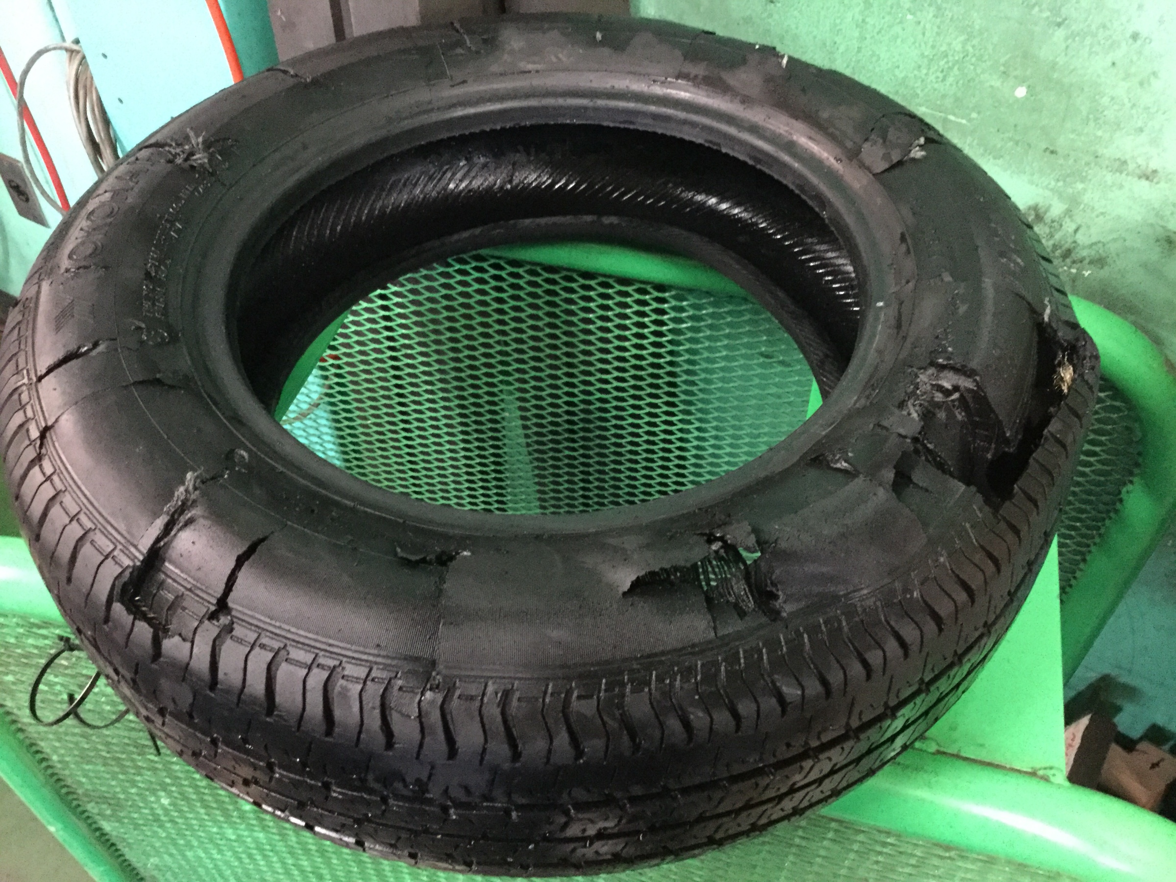 写真は台風とは無関係ですが、パンクに気づかず走行しますとこのようにタイヤがぼろぼろ