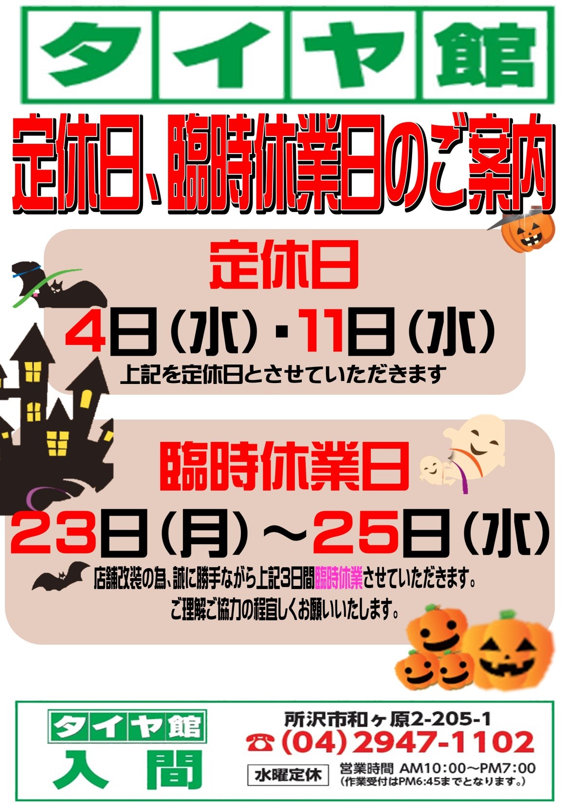 10/4(水)定休日 ポスト 2017年10月2日 明後日10/4(水)は定休日となります。 今月23日(月)~25日(水)は誠に勝手ながら、店舗改装のため、お休みさせていただきます。 宜しくお願いいたします。 タイヤ館入間