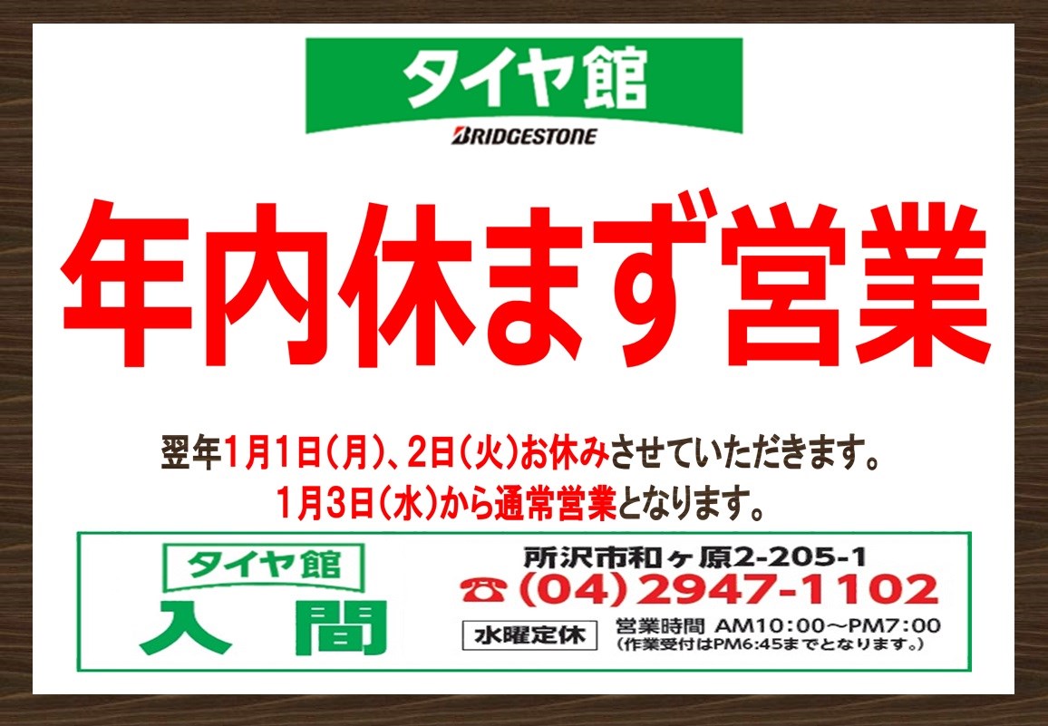 12月の営業と年末年始のご案内 ポスト 2017年12月1日 おはようございます。 今日から12月、10時タイヤ館入間openしました。 毎月1日~7日は「レディースウィーク」12月も今日1日から女性にお得な7日間スタートです! 12月の当店は、大晦日31日(日)まで休まず営業させていただきます! 翌年1月1日(月)、2日(火)はお休みとなりますので宜しくお願いいたします。