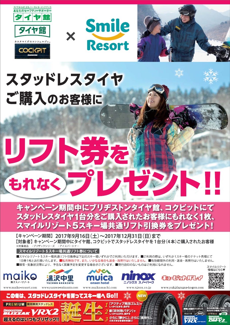 スタッドレスタイヤ4本ご購入の方に「リフト券」をもれなくプレゼント中\(^o^)/