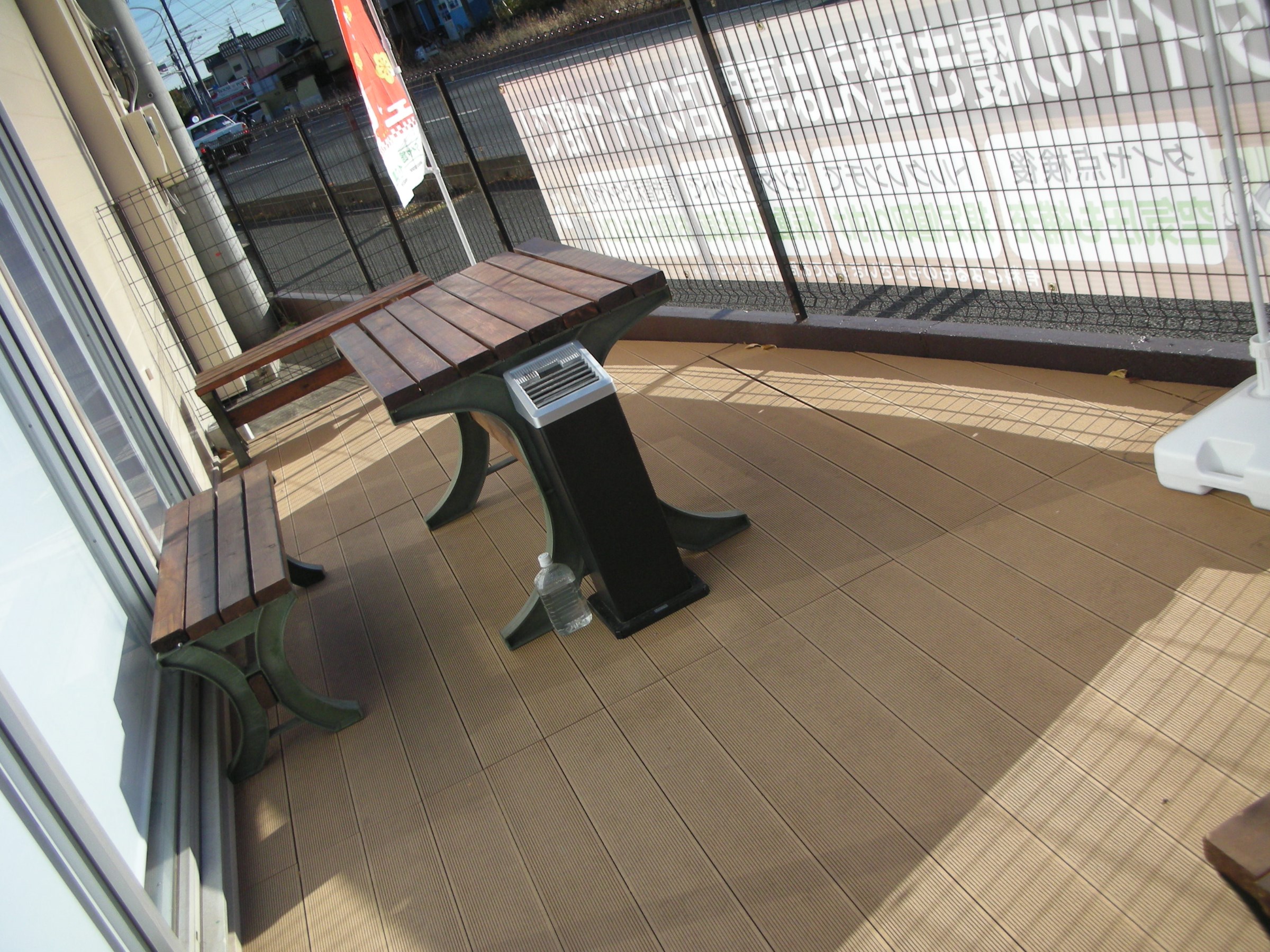 表には喫煙スペースを兼ねたウッド調デッキ。