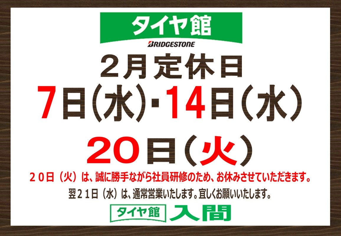 タイヤ館入間2月の定休日は上記の通りとなります。
