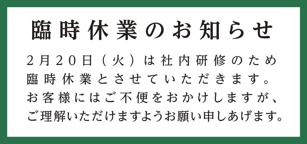 上記の通り2月20日(火)は社内研修のため、臨時休業とさせていただきます。