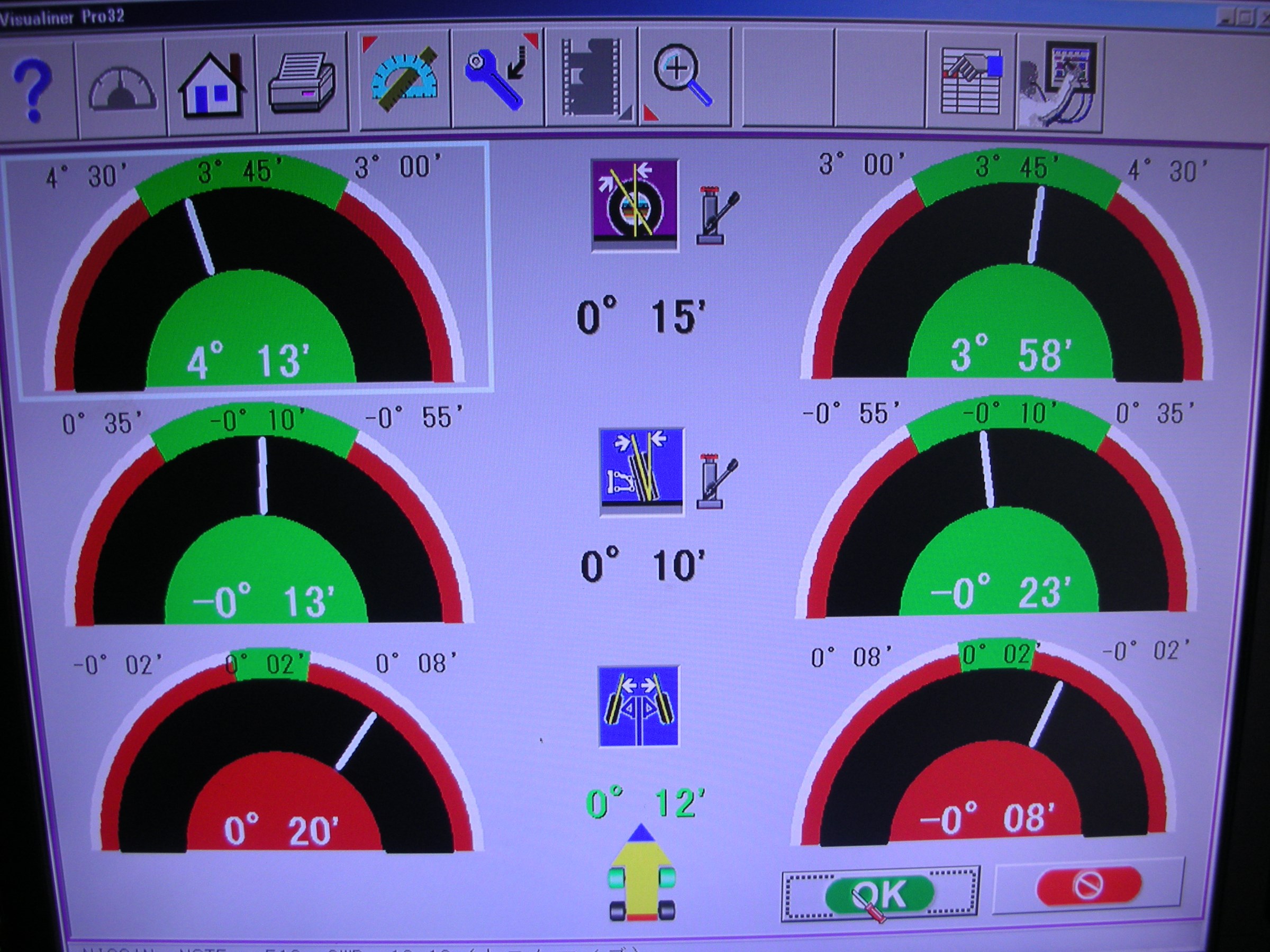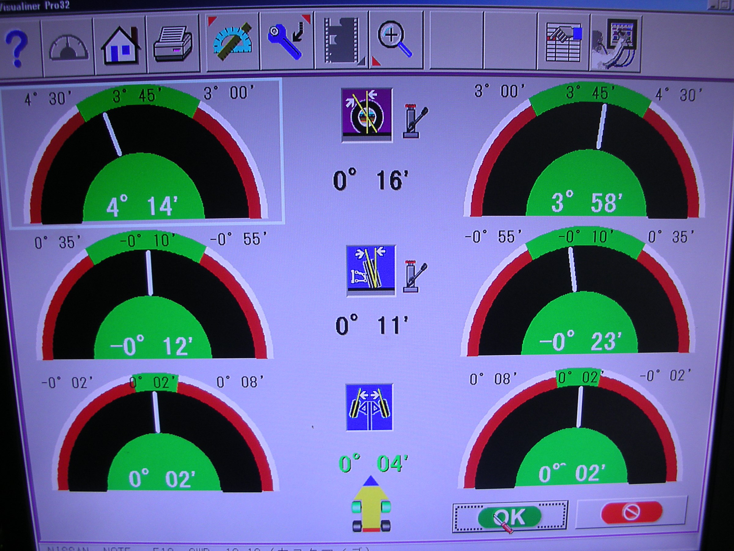 こんなカンジでハンドルのセンターがズレていたり、トータルトー(人間でいうところのつま先の向き)が基準より内股になっていると、スキーでいうところのボーゲン状態ですので、走行時に抵抗となってしまいます。そしたら抵抗になる分、燃費も落ちますよね?