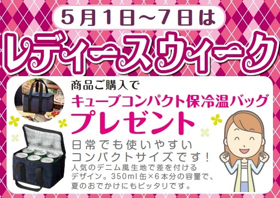 7日 本日まで! ポスト 2018年5月7日 毎月1日~7日のレディースウィーク 5月のレディースウィークは7日(月)の本日まで! 女性のお客様のオイル交換がお買い得☆ 商品ご購入の方に「キューブ保冷温コンパクトバッグ」プレゼントさせていただいています! ~無料安全点検実施中~GWのお出かけ後の愛車のメンテナンスもお任せください。 レディースウィークは本日まで! ご来店お待ちしております!