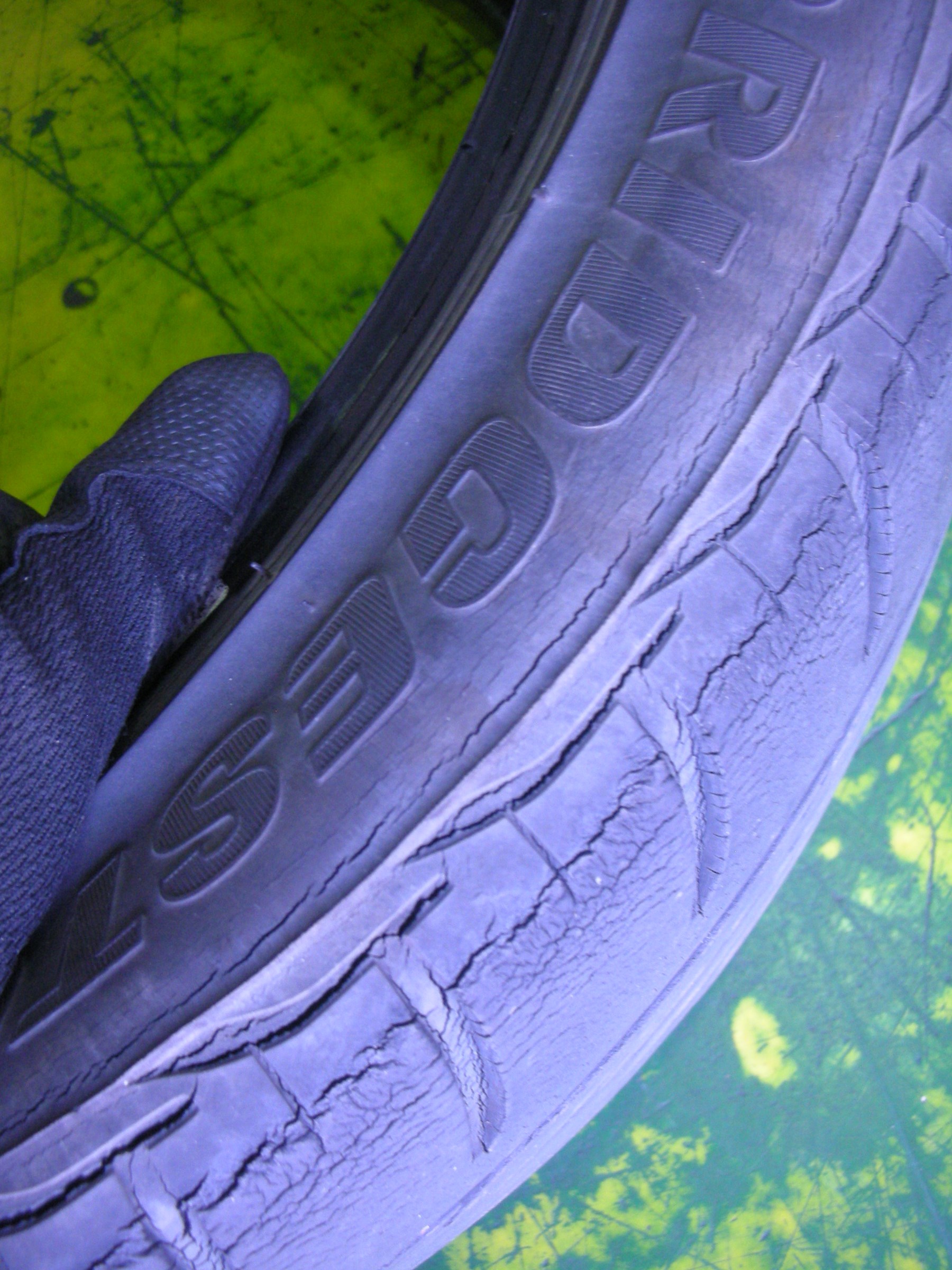 画像に向かって右端の方に細かなヒビが見られますが、溝まだしっかりしてるし、普通に走れてしまいそうですね。