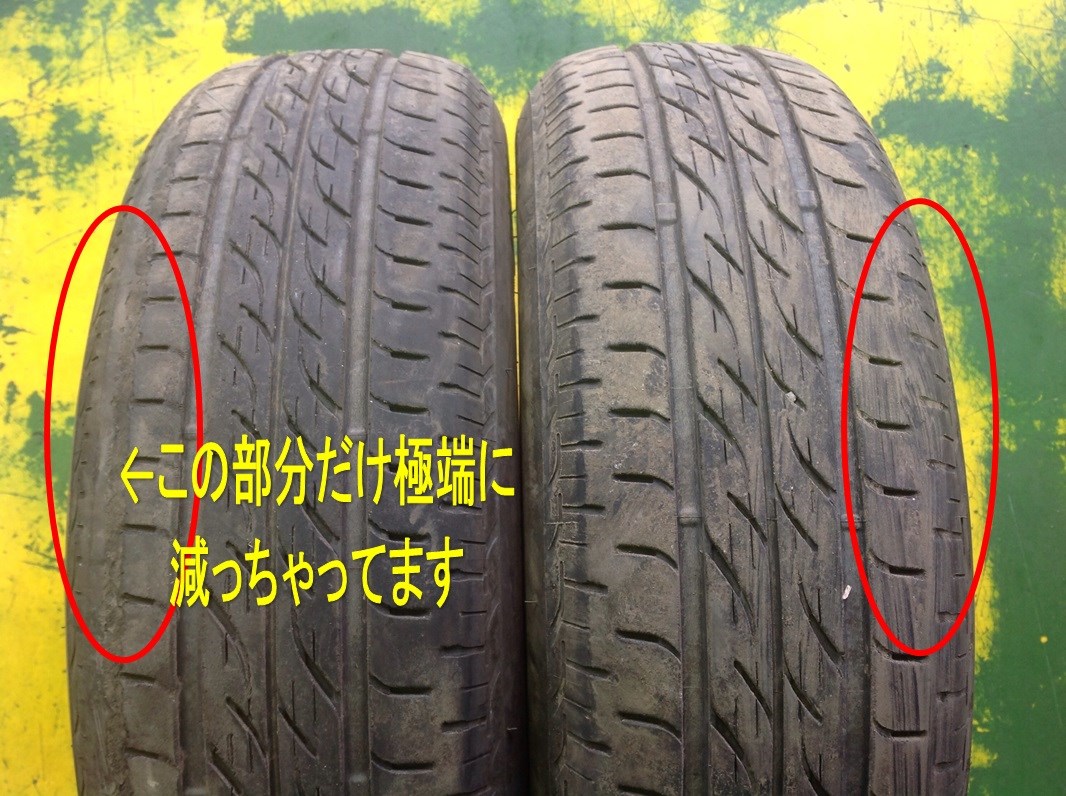 右のタイヤと比べて、左のタイヤは外側がかなり擦り減っています…こんな状態になってしまうかも!