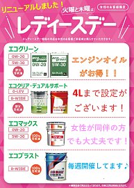 火曜日・木曜日はレディースデーでエンジンオイルがお得!!