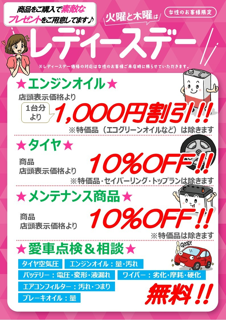 タイヤ館入間店のホームページをご覧いただきありがとうございます♪ 当店、タイヤ館入間店では 【火曜日・木曜日】にレディースデーを実施しております!! みなさまからのご要望にお応えして サービス内容をリニューアルしました (^^)/ ◆◇◆タイヤ館入間のレディースデー◆◇◆ ① エンジンオイルがお得...