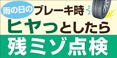 梅雨シーズン ミゾの少ないタイヤ、雨の日のスリップに注意! 安全・安心なカーライフのために 空気圧・偏摩耗・外傷・残溝 タイヤ専門店のプロスタッフがしっかり点検させていただきます。 無料タイヤ点検実施中です!